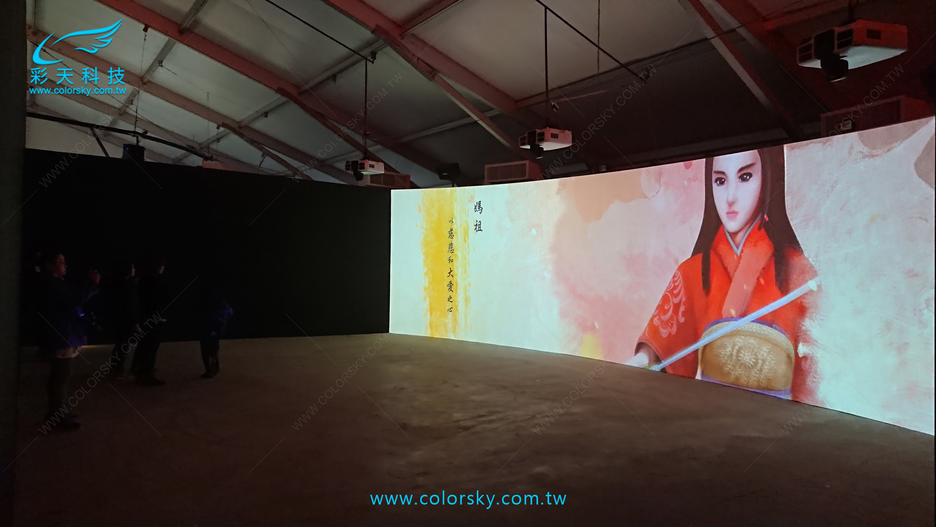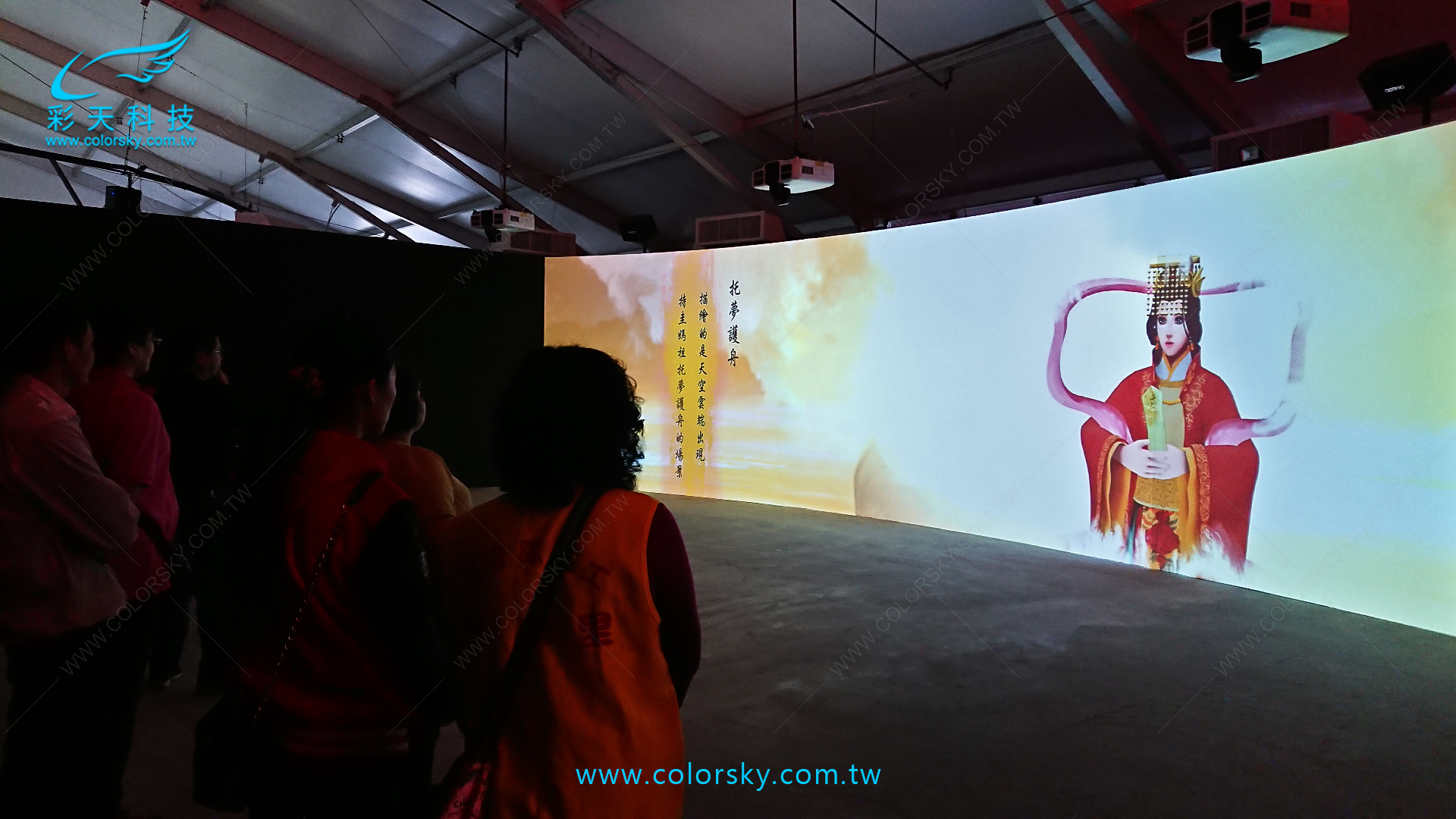 媽祖光影展 A 館以「媽祖傳記」為主題,建置大型曲面投影牆,影片以3D建模動畫製作,呈現媽祖從民間信仰到天后封號的歷史故事。曲面投影牆的弧形特性與視覺延展效果,使動畫中的人物與場景更加立體生動。