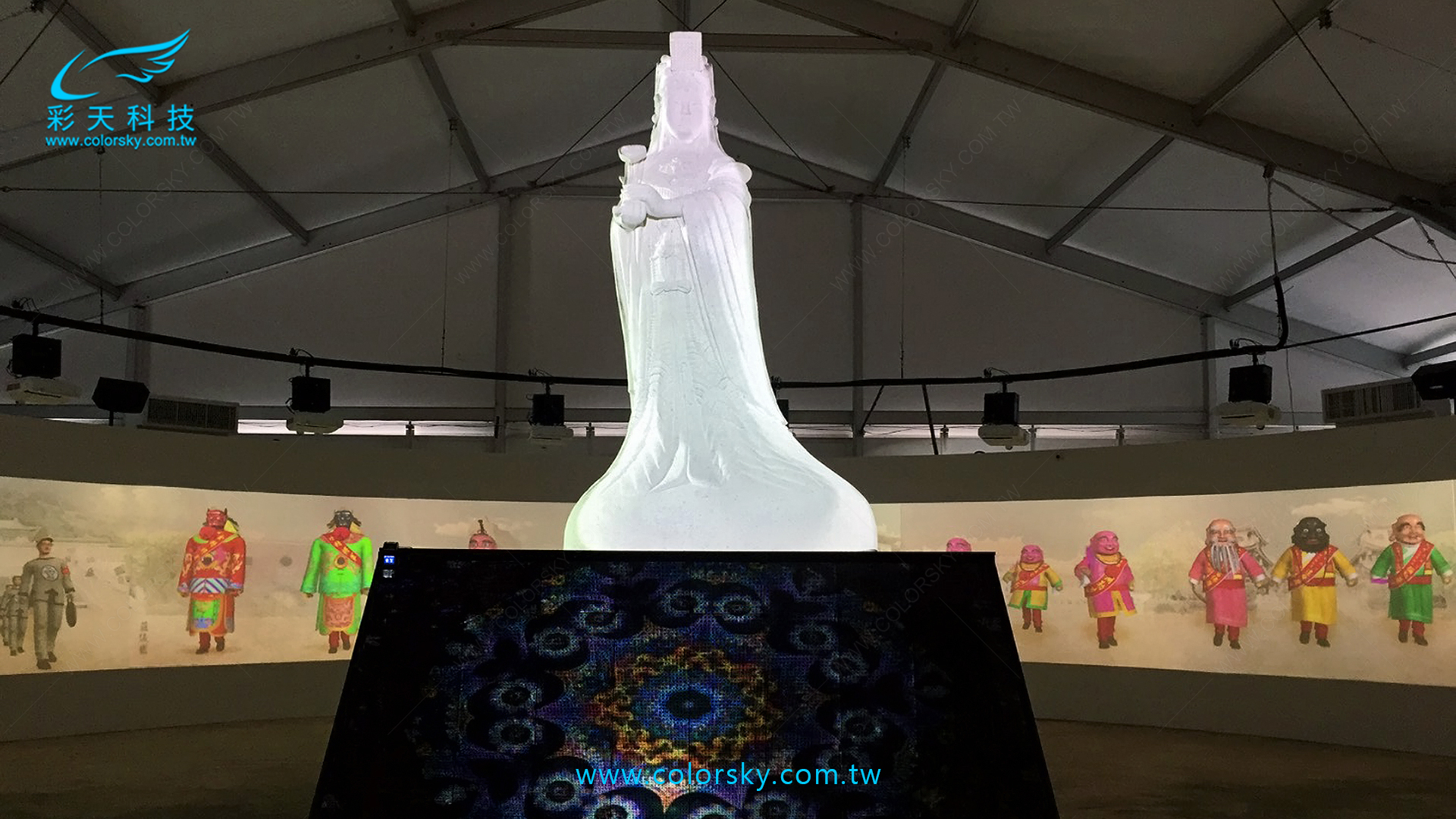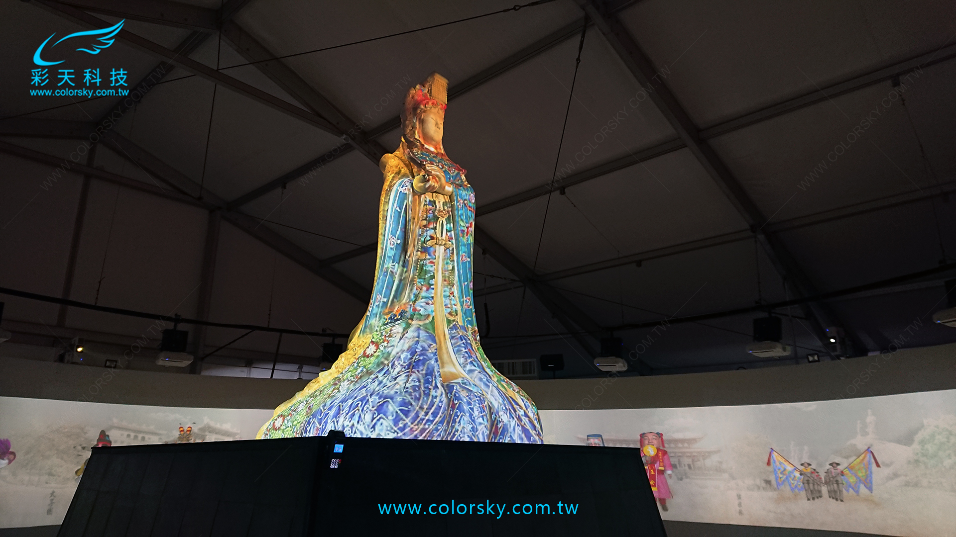 媽祖光影展 B 館以媽祖信仰文化為核心,精心打造媽祖聖像雕像作為光雕主體,透過360度光雕投影技術精準投影於立體媽祖聖像上。影像內容融合五行意象,運用動態光影轉換呈現不同能量層次,強化整體視覺張力與文化寓意,體現宗教藝術與數位影像技術的深度融合。