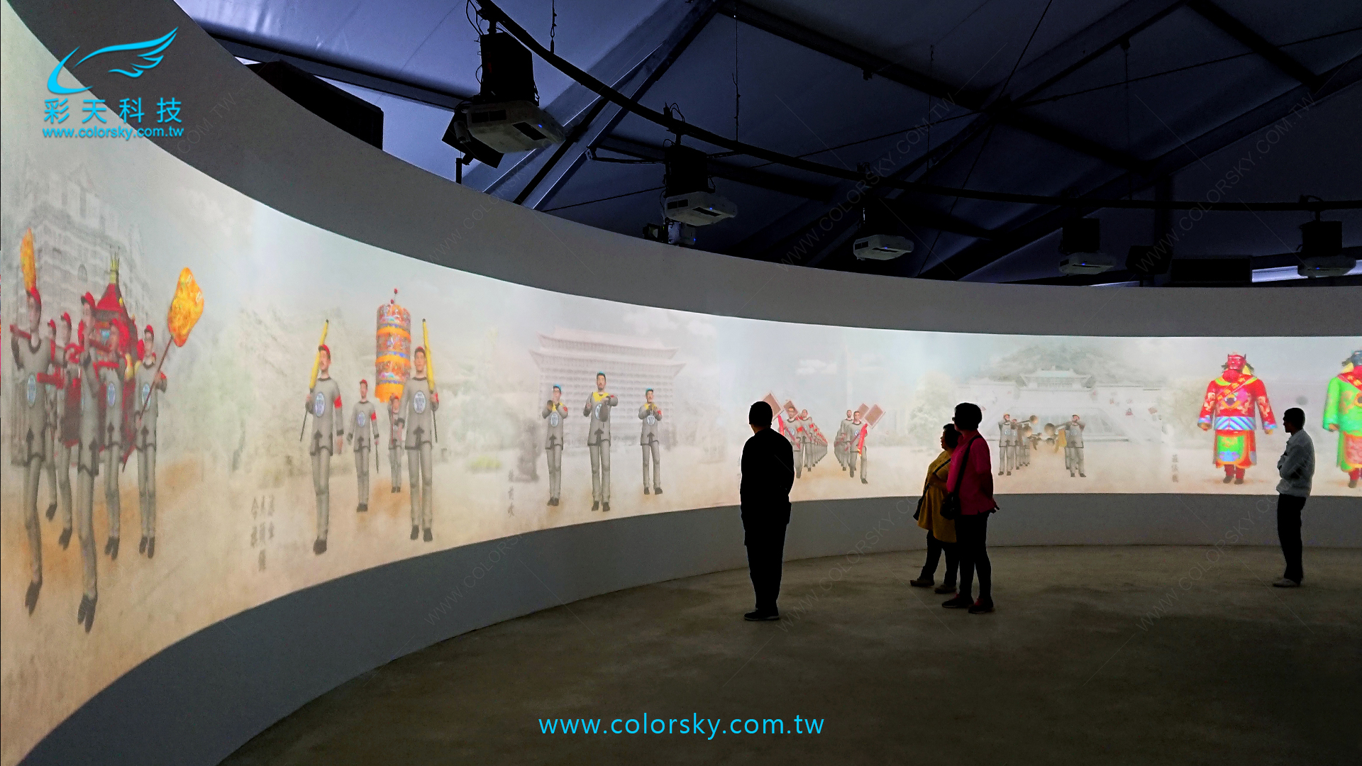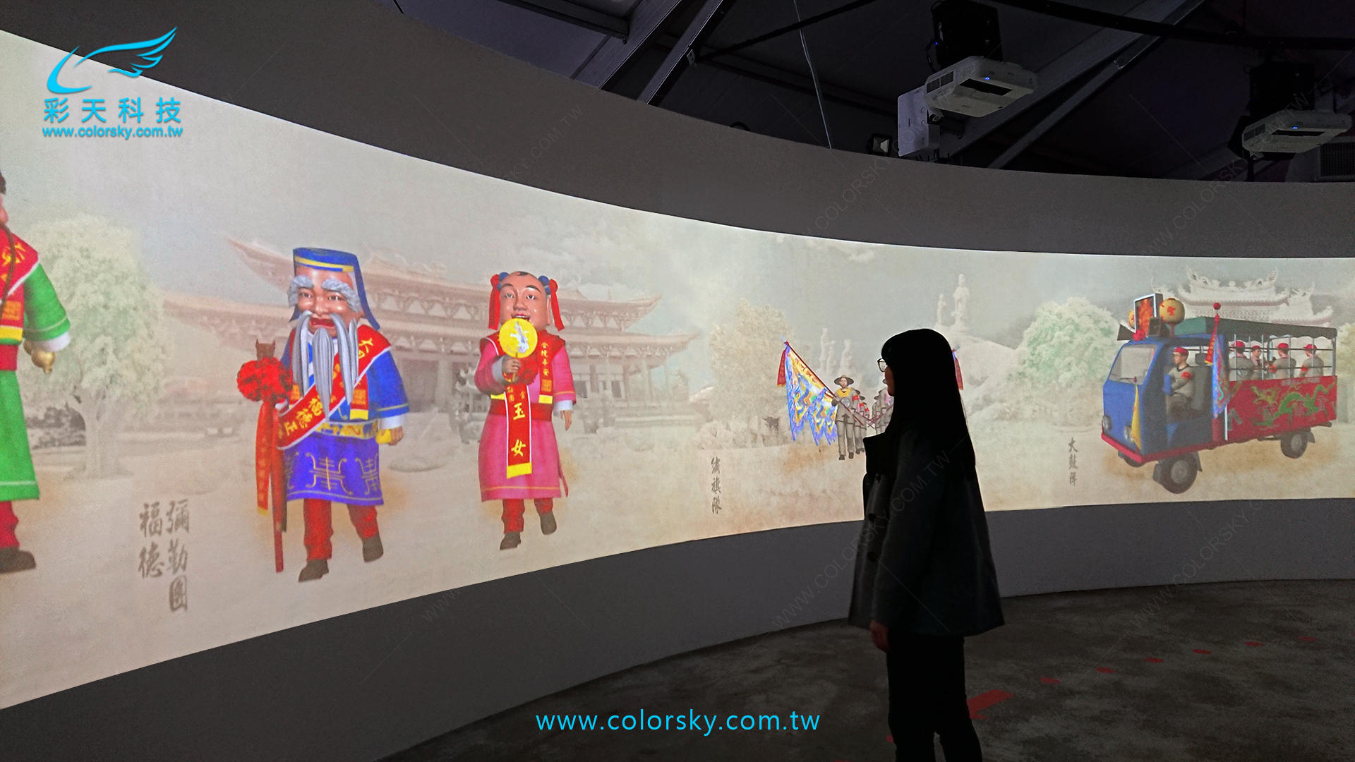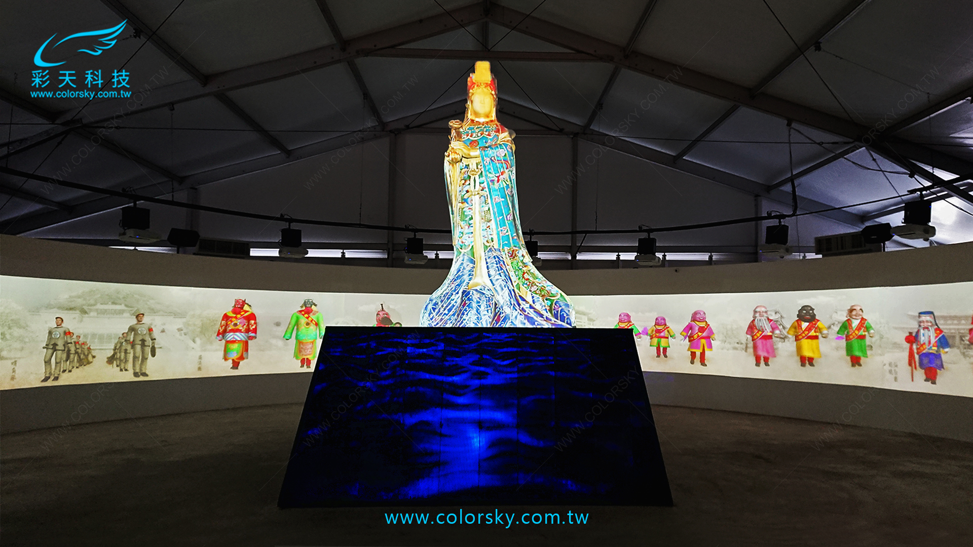 媽祖光影展 B 館以「媽祖遶境進香陣列」為主題,整體空間規劃為360度環形場域並結合媽祖聖像光雕投影,運用3D動畫影像呈現五大陣頭與媽祖神轎動態行進互動畫面。參訪民眾隨動線行進即可觸發互動感應區,使陣頭即時呈現行禮動作為民眾祈福,營造沉浸式文化體驗。