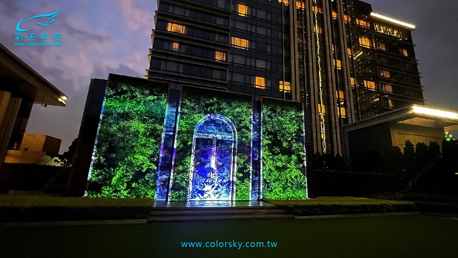 於台北萬豪酒店 8 樓 Garden Villa 歐式禮堂建築立面打造婚禮專屬光雕投影,透過精準投影校正與動態影像演繹,將禮堂外觀轉化為沉浸式浪漫場景。整體視覺隨情境流轉,營造層次豐富的夢幻婚禮氛圍,讓新人與賓客共同沉浸於兼具視覺震撼與情感溫度的難忘體驗。