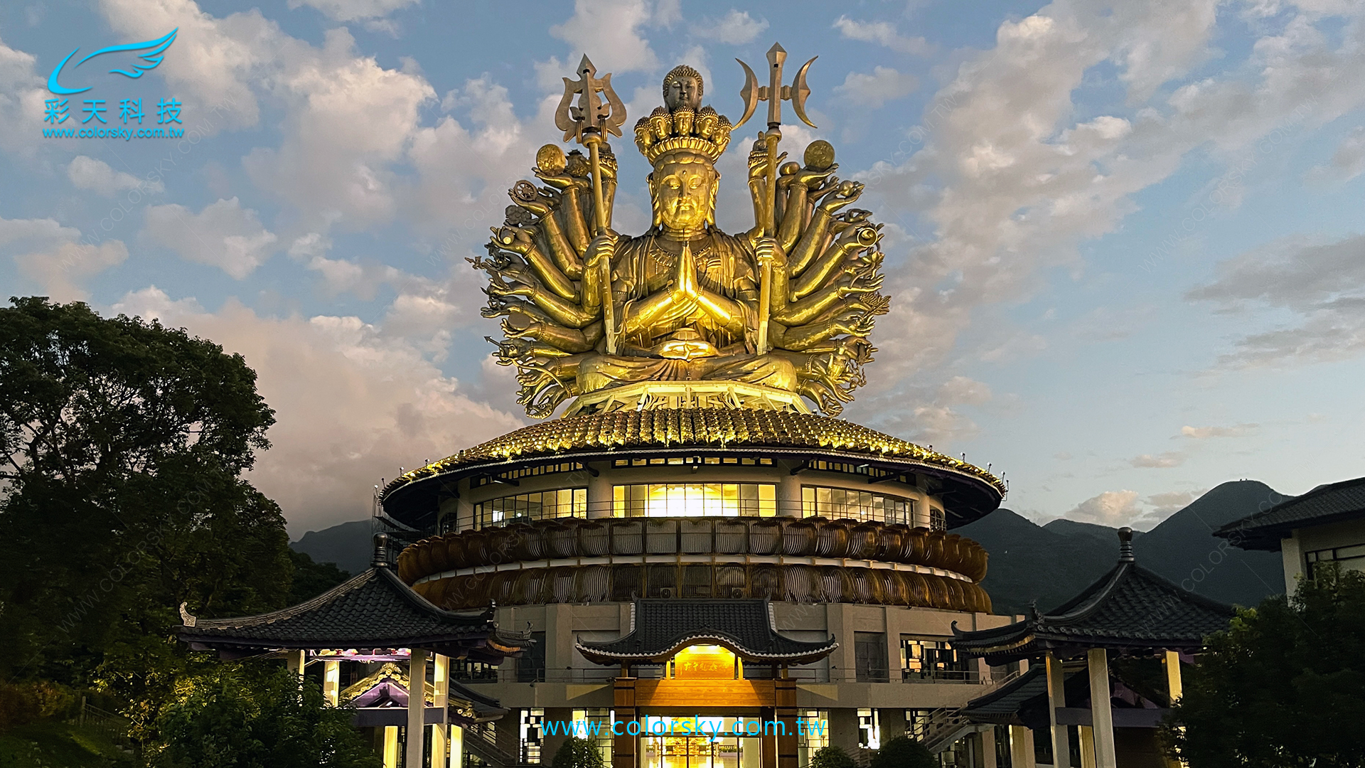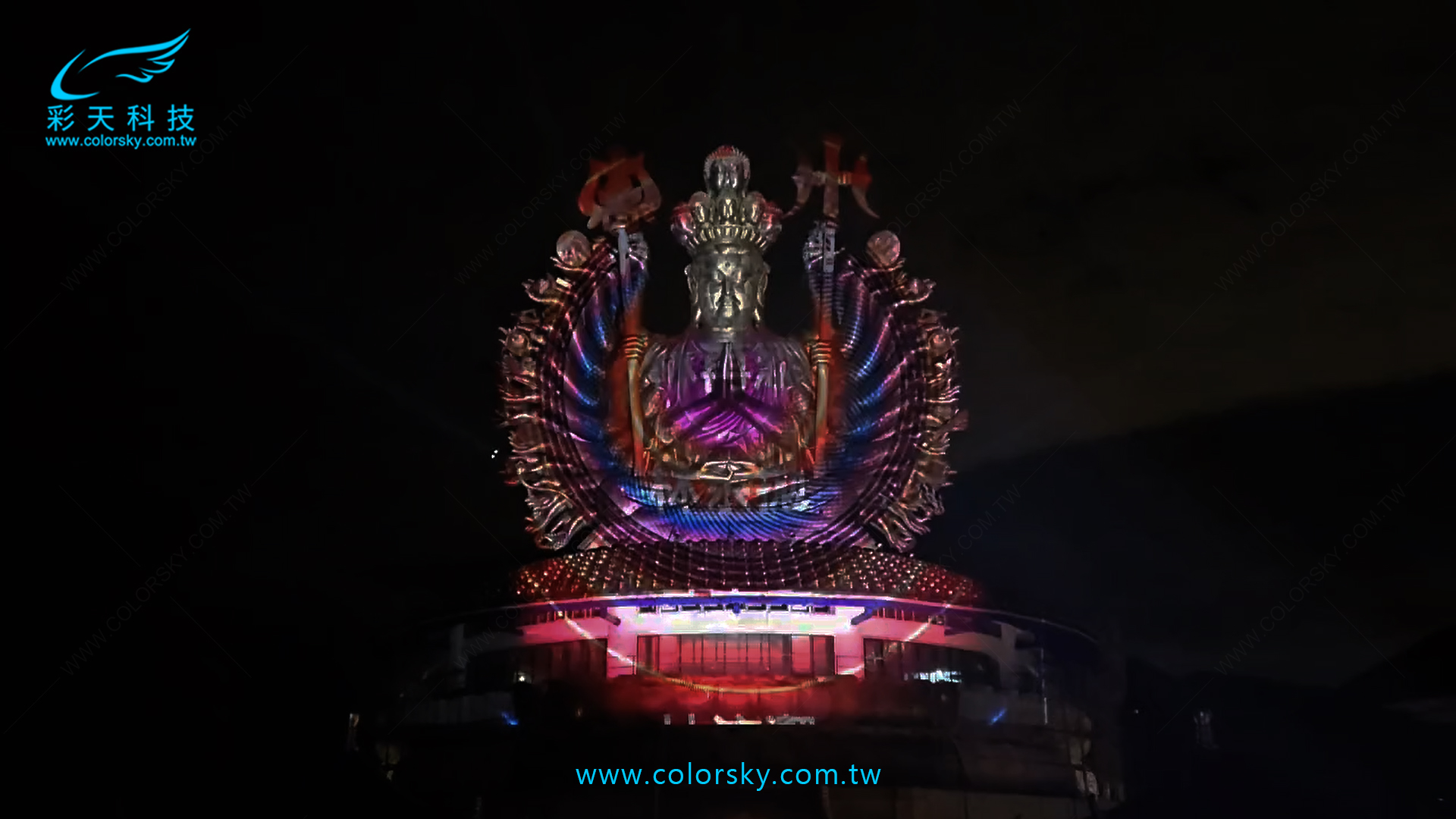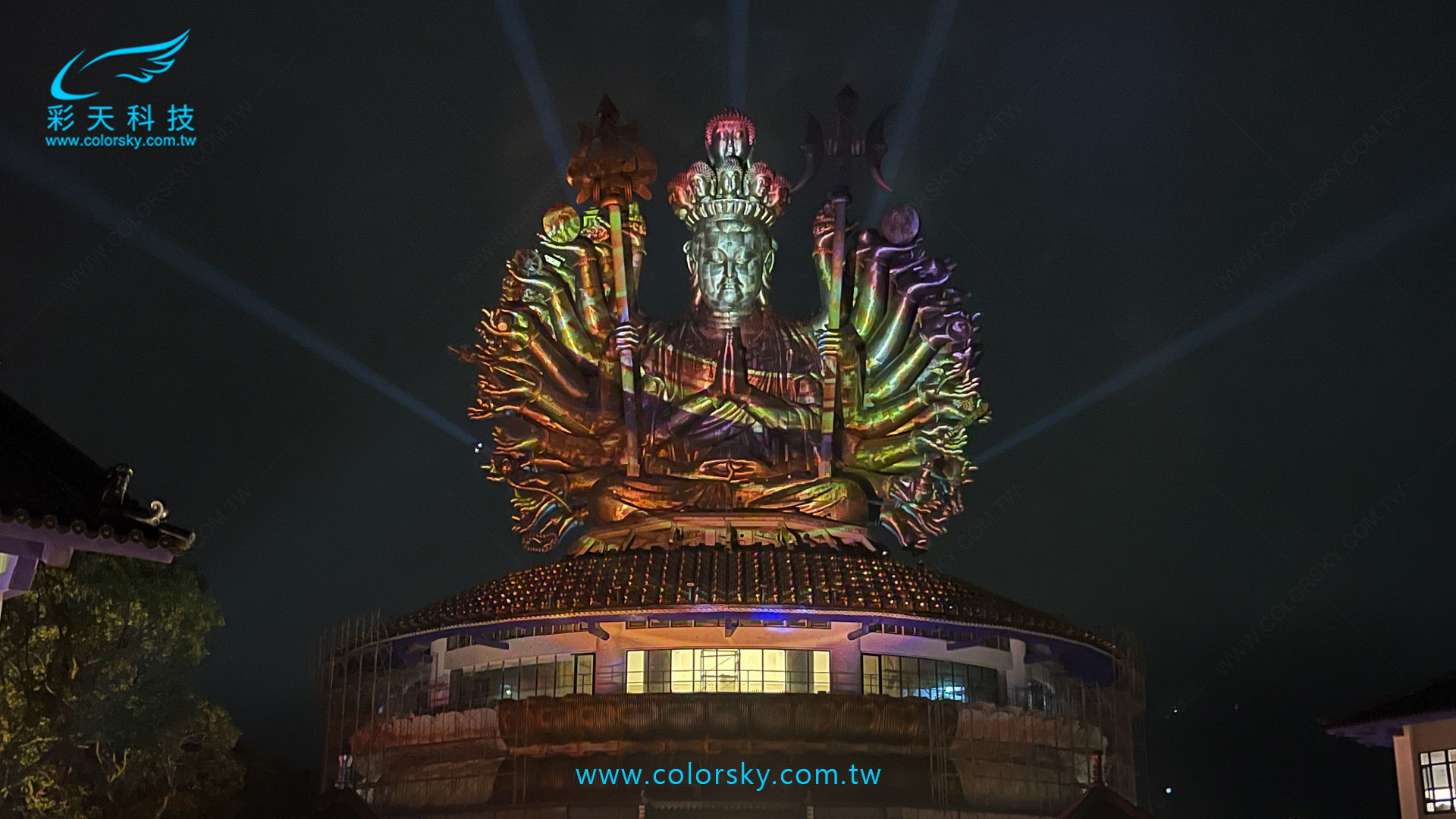 為迎接2024至2025年新春期間,緣道觀音廟攜手彩天科技,打造「千手千眼觀世音菩薩光雕投影秀」,將傳統宗教信仰結合數位投影科技,克服鋼構材質反光與曲面投影的技術挑戰,將千手千眼的層層結構轉化為流動光影,在夜色中綻放莊嚴與神聖。