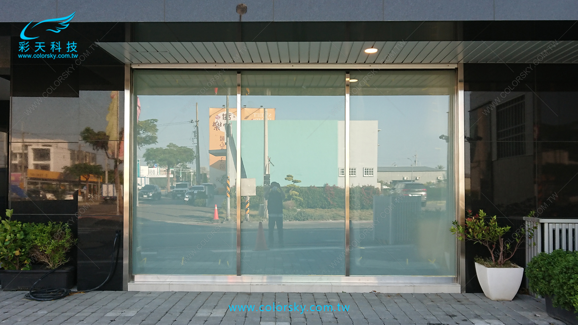 台南-安富億.南泰億建設-房屋接待中心,玻璃櫥窗採用大尺寸CS智能電控玻璃/膜,白天時呈現透明可讓民眾觀看店內展示,夜間時呈現霧面狀態搭配背投影播放成為動態櫥窗廣告。