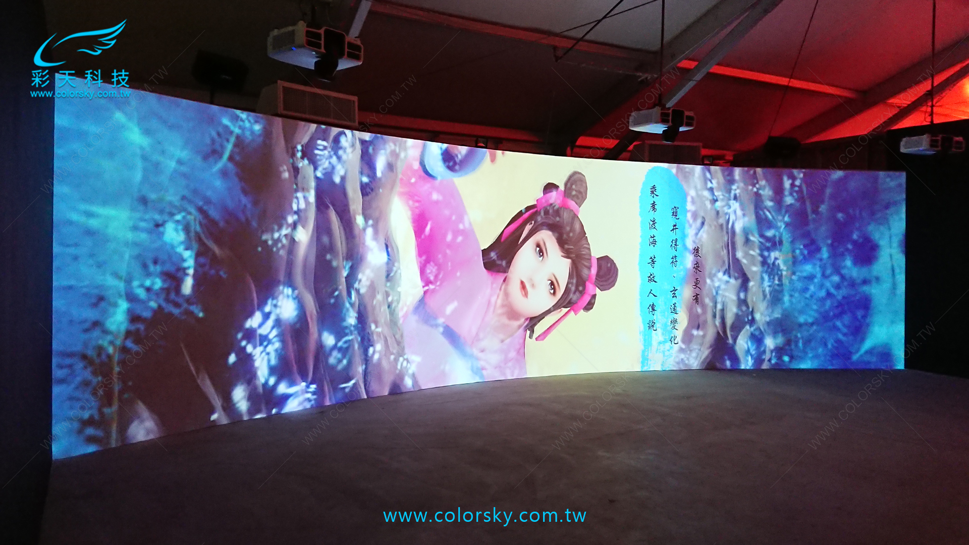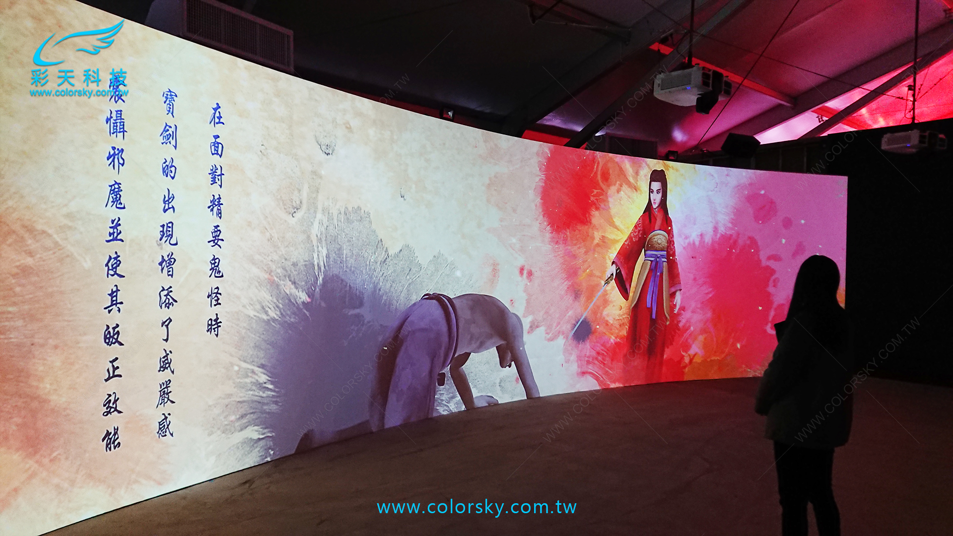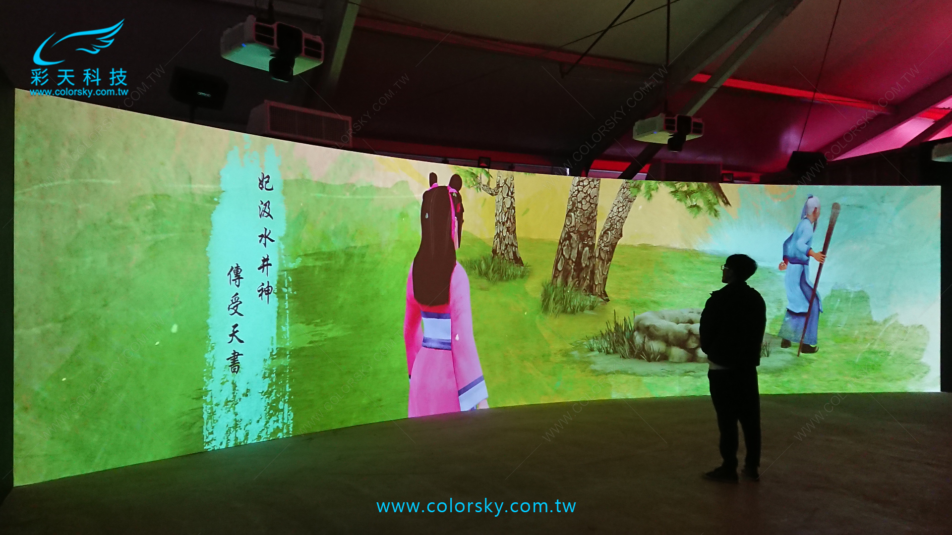 媽祖光影展 A 館以「媽祖傳記」為主題,建置大型曲面投影牆,影片以3D建模動畫製作,呈現媽祖從民間信仰到天后封號的歷史故事。曲面投影牆的弧形特性與視覺延展效果,使動畫中的人物與場景更加立體生動。