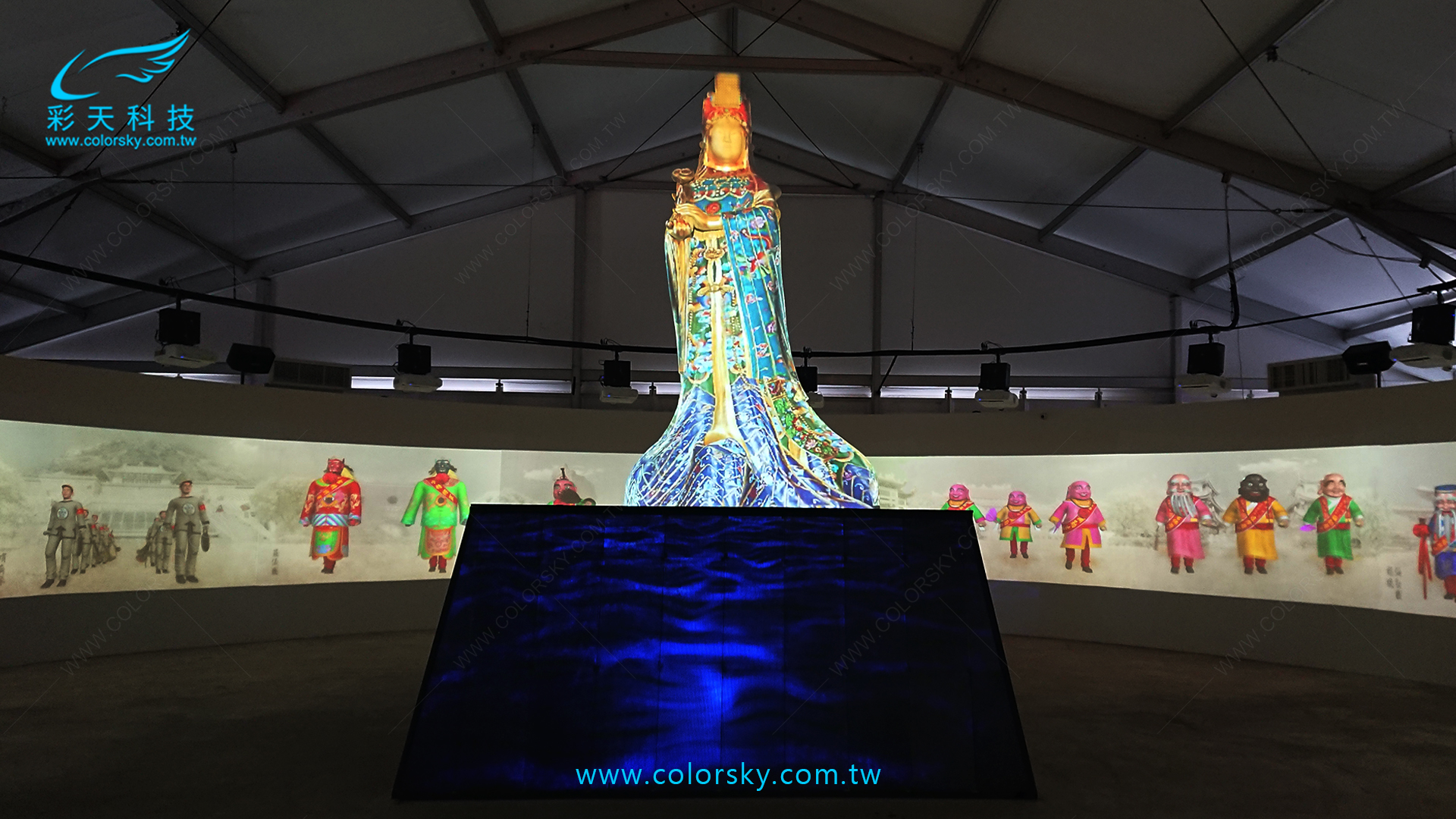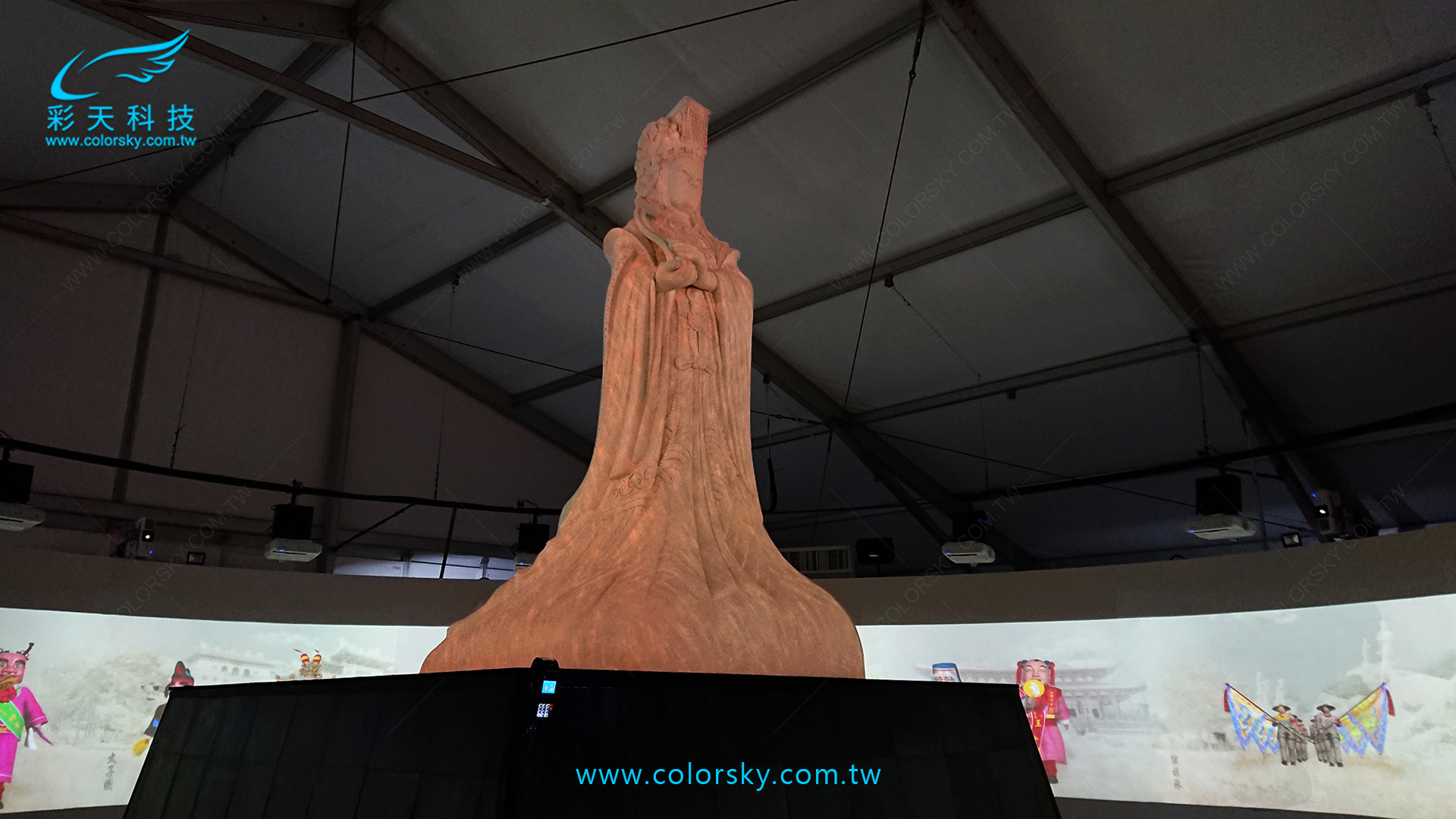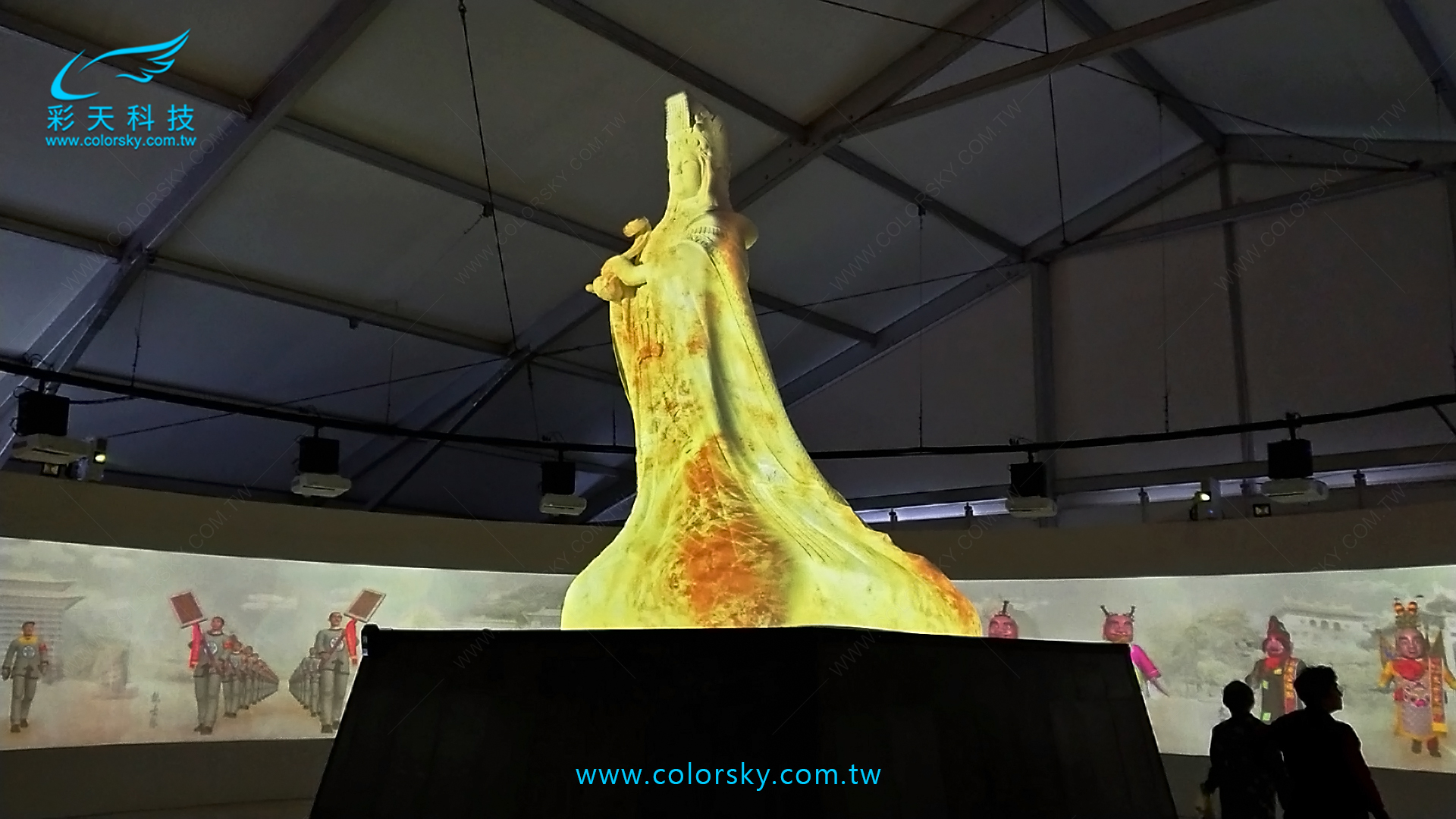 媽祖光影展 B 館以媽祖信仰文化為核心,精心打造媽祖聖像雕像作為光雕主體,透過360度光雕投影技術精準投影於立體媽祖聖像上。影像內容融合五行意象,運用動態光影轉換呈現不同能量層次,強化整體視覺張力與文化寓意,體現宗教藝術與數位影像技術的深度融合。