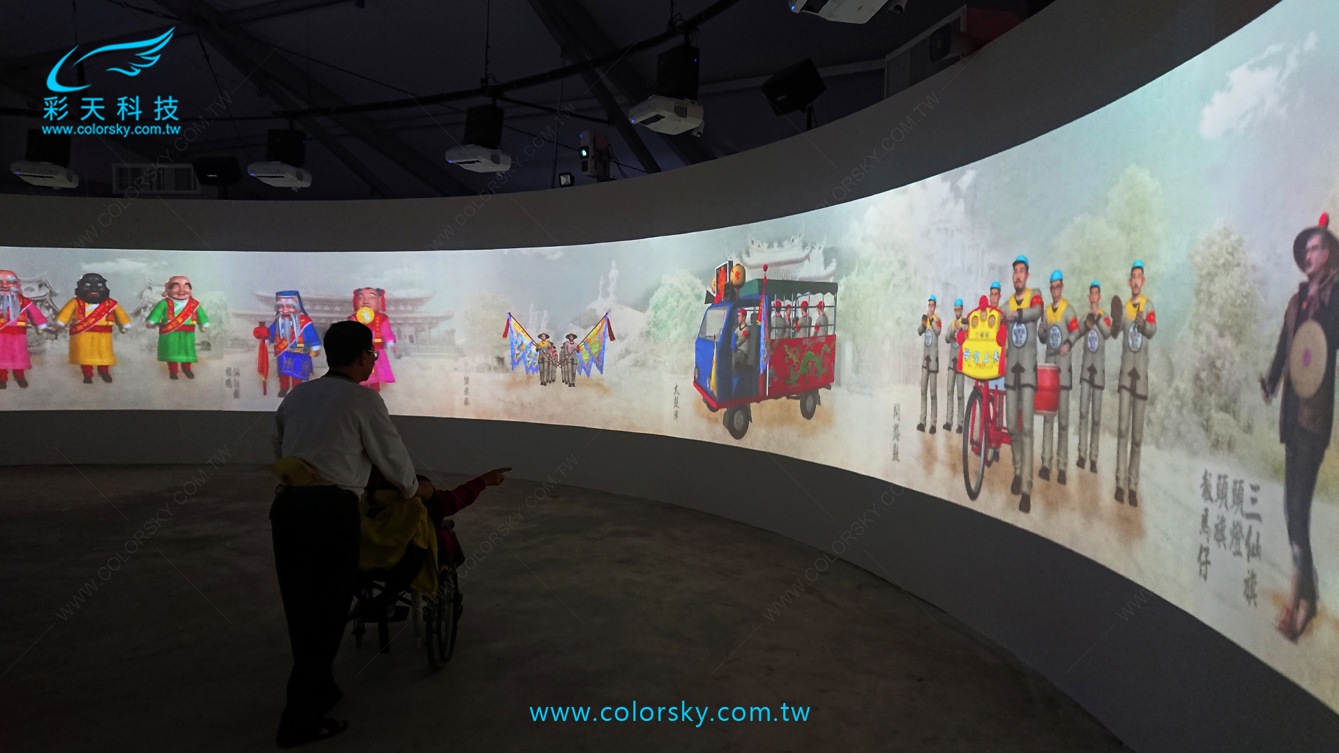 媽祖光影展 B 館以「媽祖遶境進香陣列」為主題,整體空間規劃為360度環形場域並結合媽祖聖像光雕投影,運用3D動畫影像呈現五大陣頭與媽祖神轎動態行進互動畫面。參訪民眾隨動線行進即可觸發互動感應區,使陣頭即時呈現行禮動作為民眾祈福,營造沉浸式文化體驗。