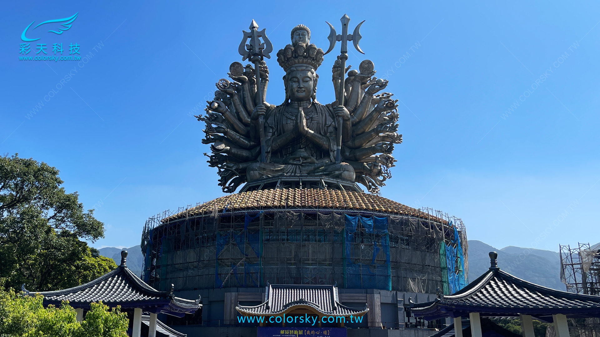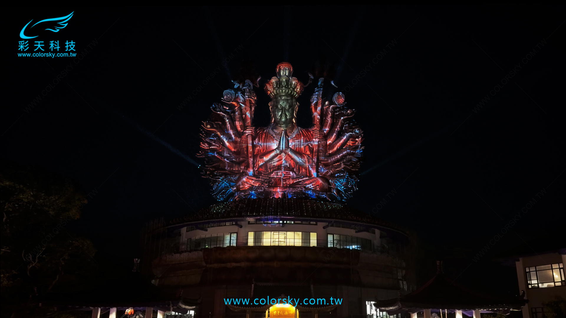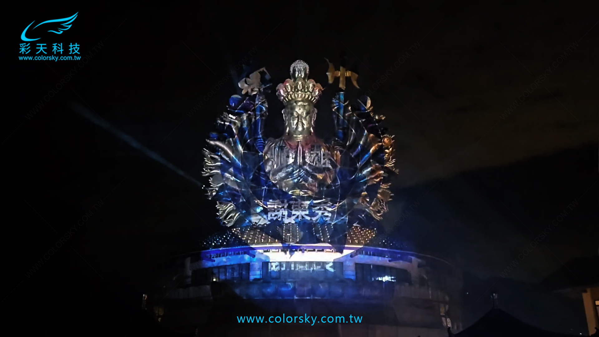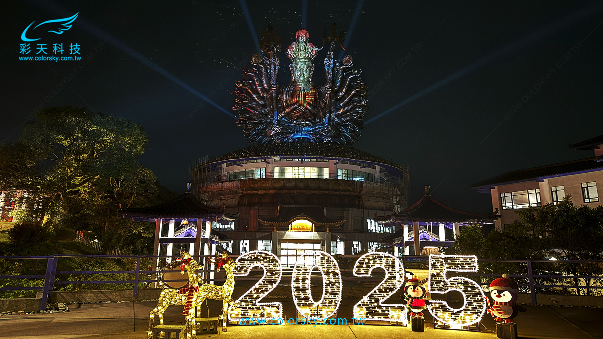 為迎接2024至2025年新春期間,緣道觀音廟攜手彩天科技,打造「千手千眼觀世音菩薩光雕投影秀」,將傳統宗教信仰結合數位投影科技,克服鋼構材質反光與曲面投影的技術挑戰,將千手千眼的層層結構轉化為流動光影,在夜色中綻放莊嚴與神聖。